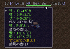 | 現在のシレンに残された切り札・・・・ 数本の杖と投擲用ギタン・・・・ そして虎の子の白紙・・・・! |